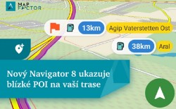 Map­Fac­tor uvádí na trh novou verzi na­vi­gač­ní apli­ka­ce Map­Fac­tor Na­vi­ga­tor 8 pro An­dro­id. Hlav­ní no­vin­kou je prak­tic­ká funk­ce zob­ra­zo­vá­ní nej­bliž­ších bodů zájmu (POI) podél trasy během na­vi­ga­ce, která ři­di­čům vý­raz­ně usnadňuje plá­no­vá­ní za­stá­vek – ať už se jedná o čer­pa­cí sta­ni­ce, na­bí­je­cí sta­ni­ce pro elek­tro­mo­bi­ly, par­ko­viš­tě, od­po­čí­va­dla nebo další místa.
